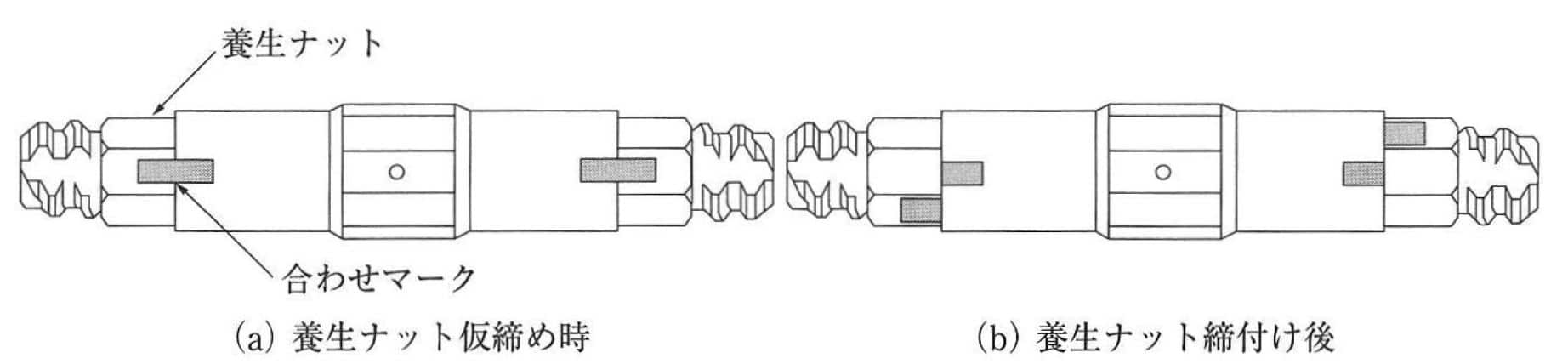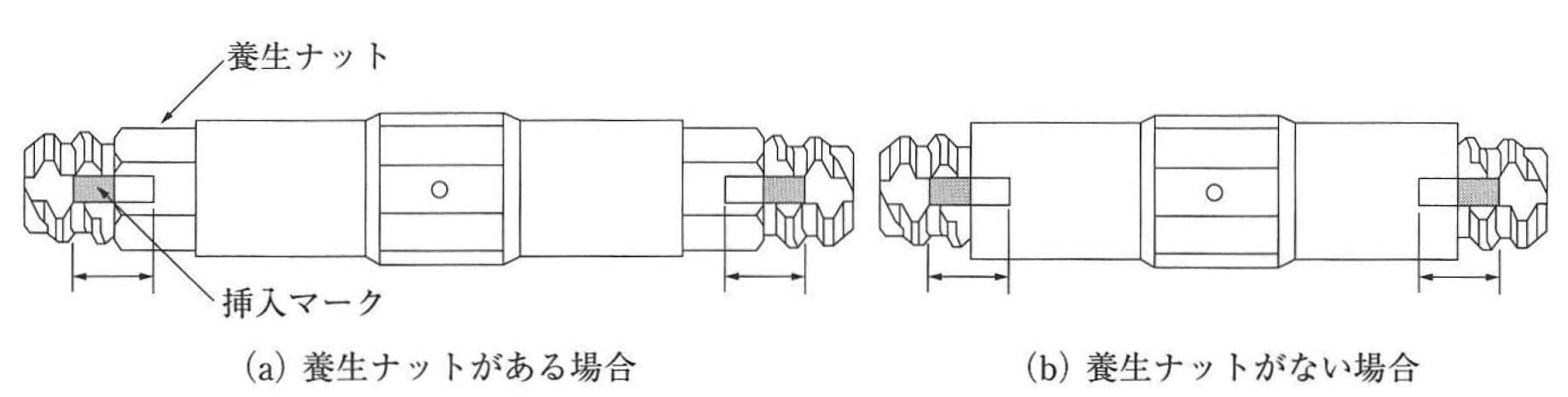スリープの外観カップラーに有害な損傷がないこと スリーブに有害な損傷がないこと カ ップラー、 固定ナットに有害な損傷がないこと 特記による 挿入マーク 挿入マークが施 されていること 挿入マークが施されていること ― 挿入長さ カップラー端 (養生ナットがある場合は、養生ナット端)が挿入マークの所定の位置(注)に あること ス リーブ端が挿入マークの所定の位置(注)にあること 所定の挿入長さ(注)にあること 合わせマーク 合わせマーク (養生ナットがある場合)がずれていること。 ― ― グラウト材 /