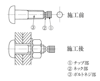 トルシア形高カボルトは、ボルトの締付けにより、図 7.2.6 に示すように、ボルトのネック部が破断することによりボルトの締付けが確認できるものである。トルシア形高カボルトのセ ットは、(一社)日本鋼構造協会規格 JSS II 09 (構造用トルシア形高力ボルト・六角ナット・平座金のセット) により規格が定められており、ボルトは S1OT と呼ぶ。その形状を図 7.2.6 に示す。