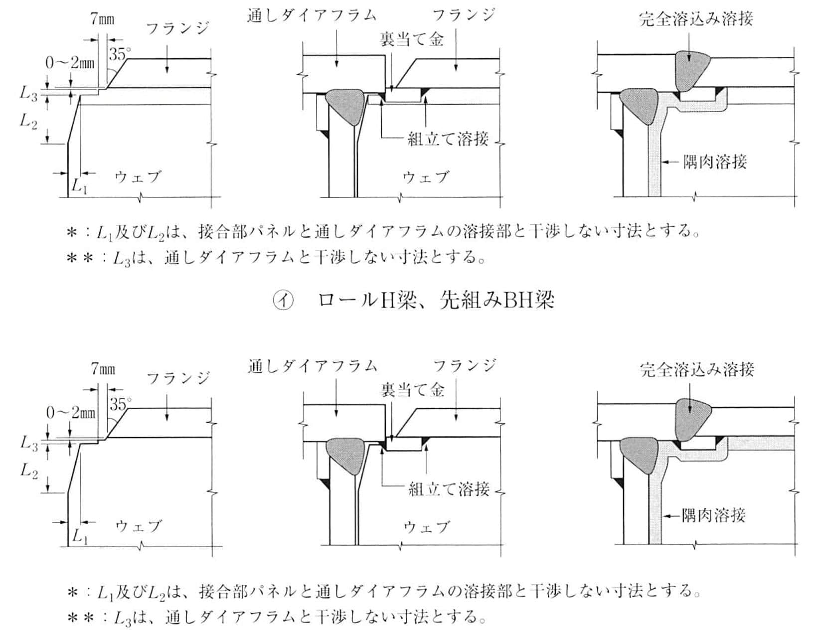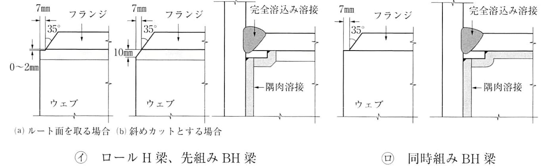 柱貫通形式では、ルート底面を残した加工又は取り合うウェブを斜めに切断する加工方法がある。梁貫通形式では、図 7.6.3 に示すように梁ウェブを切り欠いて柱側の溶接部をかわし、梁貫通形状にフィットするように開先を加工する。さらに、通しダイアフラムと梁フランジとの食い違いを避けるため、通しダイアフラムの板厚は、梁フランジの板厚の 2サイズ以上大きくし、通しダイアフラムと梁フランジを心合わせにするとよい。