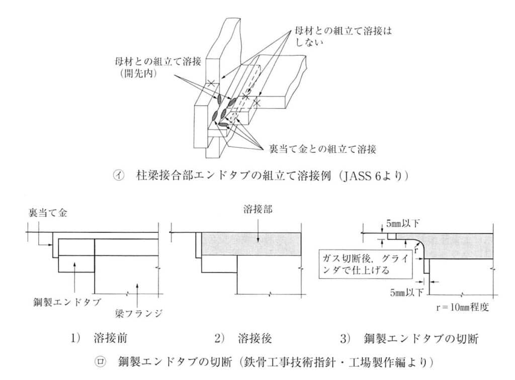 (c) サブマージアーク溶接 :70mm以上柱梁接合部における鋼製エンドタブの組立て溶接は、直接、柱及び梁のフランジに行わない。これは、組立て溶接がショートビードとなり、熱影響部の破壊靭性を低下させ、フランジの脆性破壊の起点となるおそれがあるためである。肉 7.6.8 イ に柱梁接合部における鋼製エンドタブの組立て溶接の例を示す。