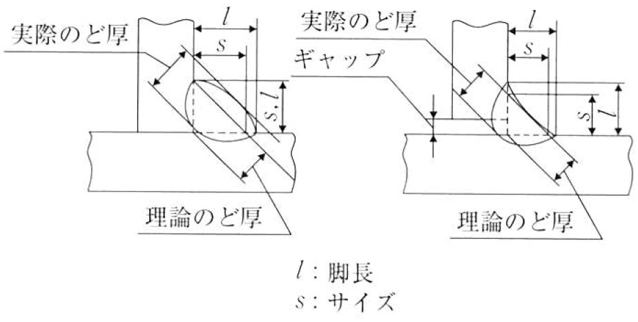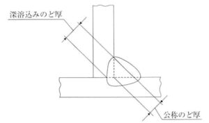 theoretical throat(すみ肉のー)実際のど厚 実際に溶接された部分ののど厚。すみ肉溶接の場合は断面のルートから表面までの最短距離とする。ルート部まで溶込みが届かない場合は、溶接金属の最下部から表面までの最短距離とする。