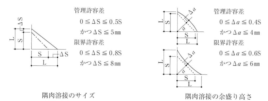 (20) 隅肉溶接のサイズ (S) の許容差 (ΔS) 及び余盛り高さの許容差 (Δa) は、「JASS 6」付則6 によれば、管理許容差として、O ≦ ΔS ≦ O.5S、かつ、ΔS ≦ 5mm、O ≦ Δa ≦ 0.4S、かつ、Δa ≦ 4mm、限界許容差として、 O ≦ ΔS ≦ O.8S、かつ、 ΔS ≦ 8mm、O ≦ Δa ≦ O.6S、かつ、Δa ≦ 6mm となっている (図 7.6.17参照)。溶接全長にわたって、前記の管理許容差を超えるサイズ及び、余盛りの過多がないことを目標に溶接を行う 。前記の限界許容差を超えた場合には、原則として、不適合品として補修することになるが、限界許容差を超えたからといって直ちに削除する必要はなく、それよりも応力の流れがスムーズになるように、溶接ビード (軸方向と直角に切った断面で見た場合の表面) の形状が、平ら又は若干のへこみとなるような補正をするほうが望ましい。